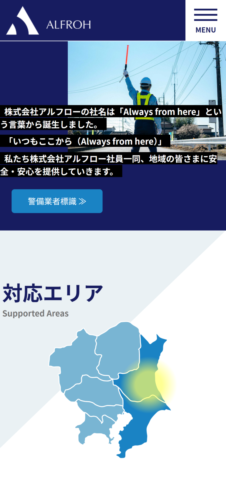 茨城県内および千葉県成田市で警備・防犯事業を展開する株式会社アルフローのコーポレートサイト制作。「Always from here(いつもここから)」という企業理念を軸にしたブランディングサイトを構築。