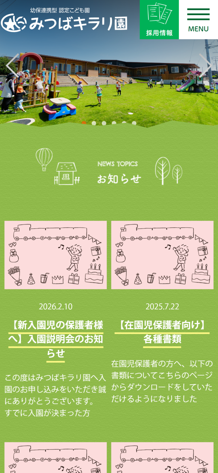 みつば幼稚園のWebサイト制作。園の教育方針、年間行事、入園案内などの情報を保護者向けに発信するサイトを構築した。